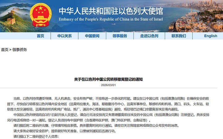 China’s embassy in Israel confirmed that it is organizing evacuation assistance and registration for Chinese nationals.