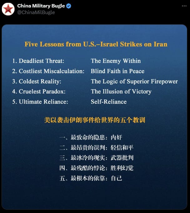 China’s official military media account China Military posted a bilingual message on X outlining what it called “Five Lessons the World Should Learn from the U.S.–Israel attack on Iran.”