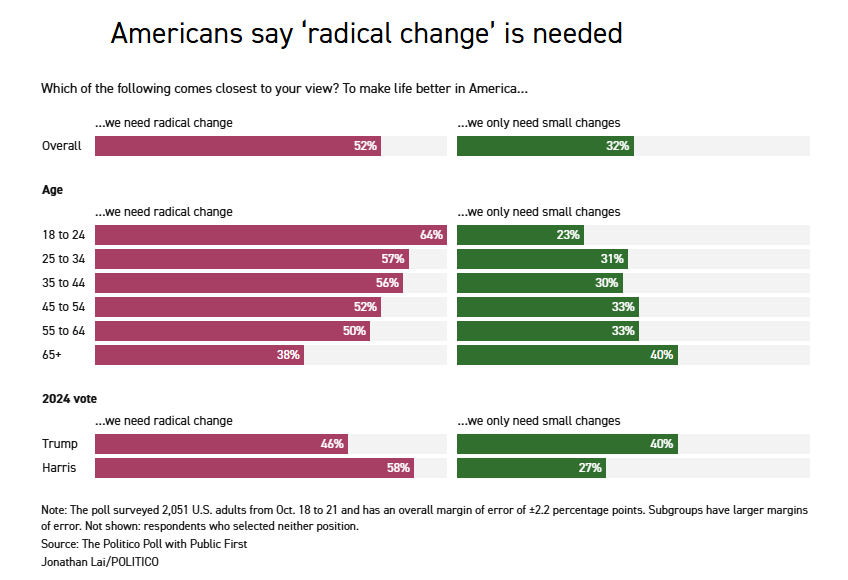 35 percent of all Americans now say the country needs a revolution. That includes 39 percent of Harris voters and 32 percent of Trump voters.