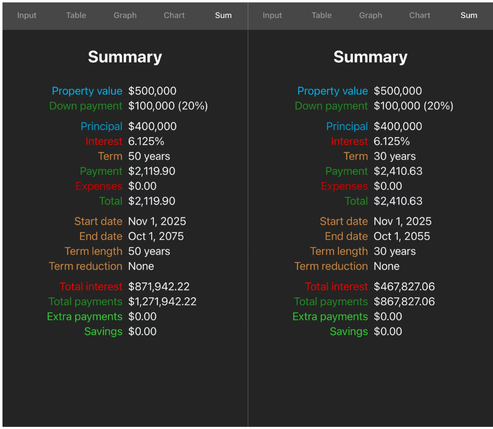 You’ll pay $467,000 in interest.On a 50-year loan, your monthly payment drops slightly to $2,119.