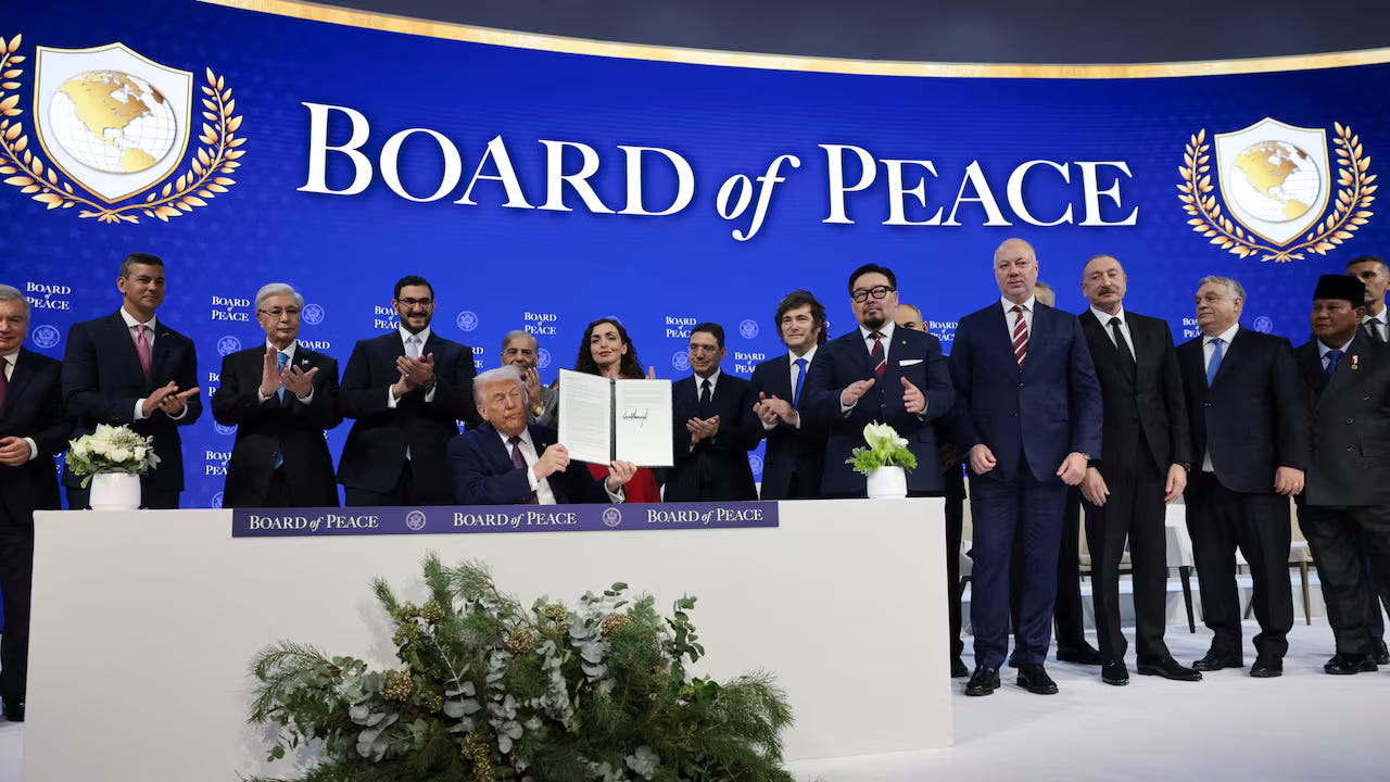 Today at the World Economic Forum in Davos, Donald Trump signed the charter for what he is calling the Board of Peace. It is being marketed as a new international mechanism to manage and resolve global conflicts, starting with Gaza. According to the White House, the Board will help lock in a Gaza ceasefire, support post war governance, and coordinate reconstruction.