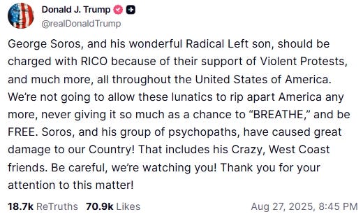 On August 27, Donald Trump threatened to bring federal racketeering charges against George Soros, age 95, and his son, Alexander. Trump accused them of funding violent protests across the United States. He wrote that Soros and his “crazy left-wing son” should be charged under RICO laws, calling them a danger to the country.