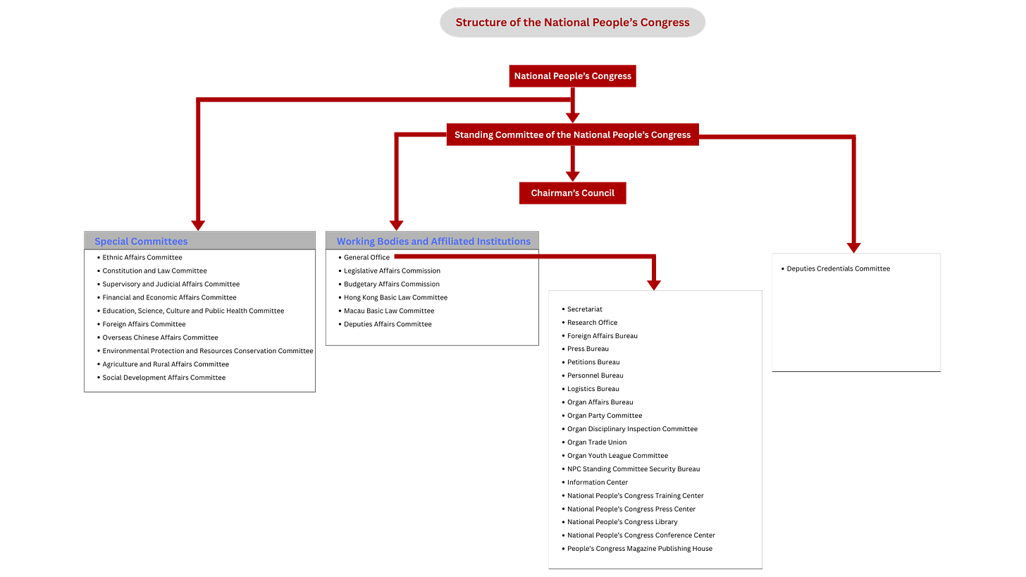 Chairman’s Council: The leadership team inside the Standing Committee. It includes the chairman, vice chairpersons, and secretary-general. It sets legislative agendas, assigns work to committees, and coordinates between different bodies.