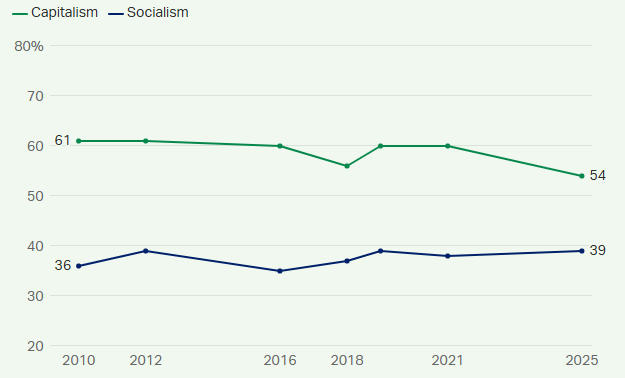 Polling shows 39% of Americans view socialism favorably, while favorable views of capitalism have been sliding. When U.S. Treasury Secretary Scott Bessent was asked about that shift, his answer was blunt: people are warming to socialism because they do not own stocks.